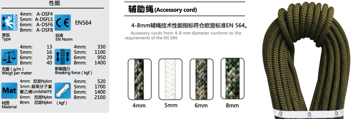 φ4mm-8mm,各種輔助用繩,破裂強(qiáng)力2.6KN-12KN,采用雙編織工藝及先進(jìn)后整理技術(shù),更加靈活的打結(jié)性能,使操作更加靈活自如,豐富多彩的色彩搭配滿足不同客戶需求。